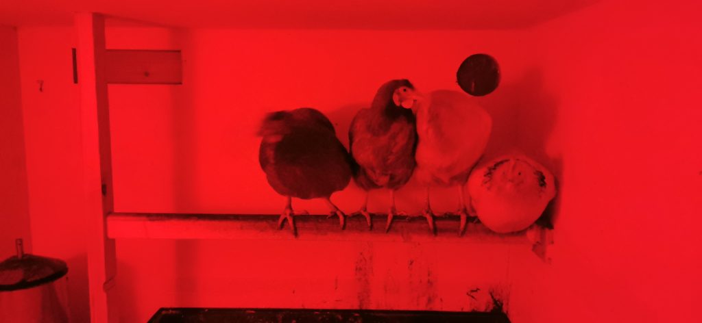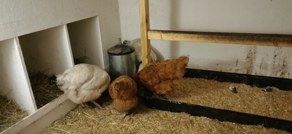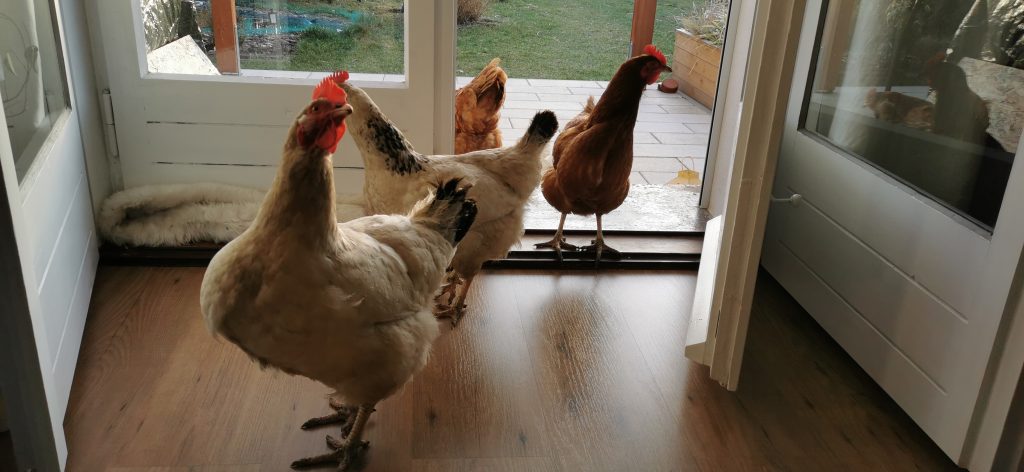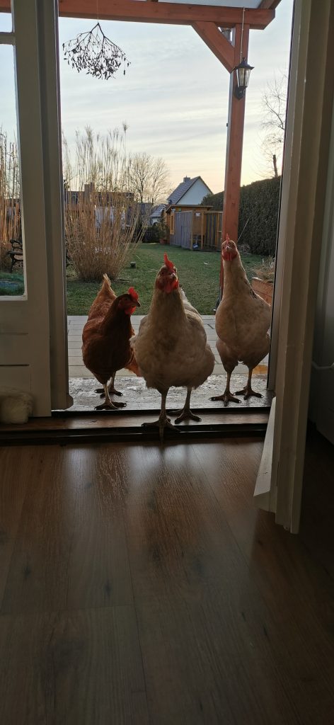 Nachdem die Hühner am Nachmittag wieder im Garten rum gelaufen sind, war es nun Zeit wieder in die Voliere zu gehen. Mein Mann hatte eine Büchse mit Körner, die er nachfüllen wollte. In meiner Büchse waren Mehlwürmer. Wie man sieht, die Hühner hören das Klappern und können sich nicht entscheiden, zu wem sie rennen… 🙂