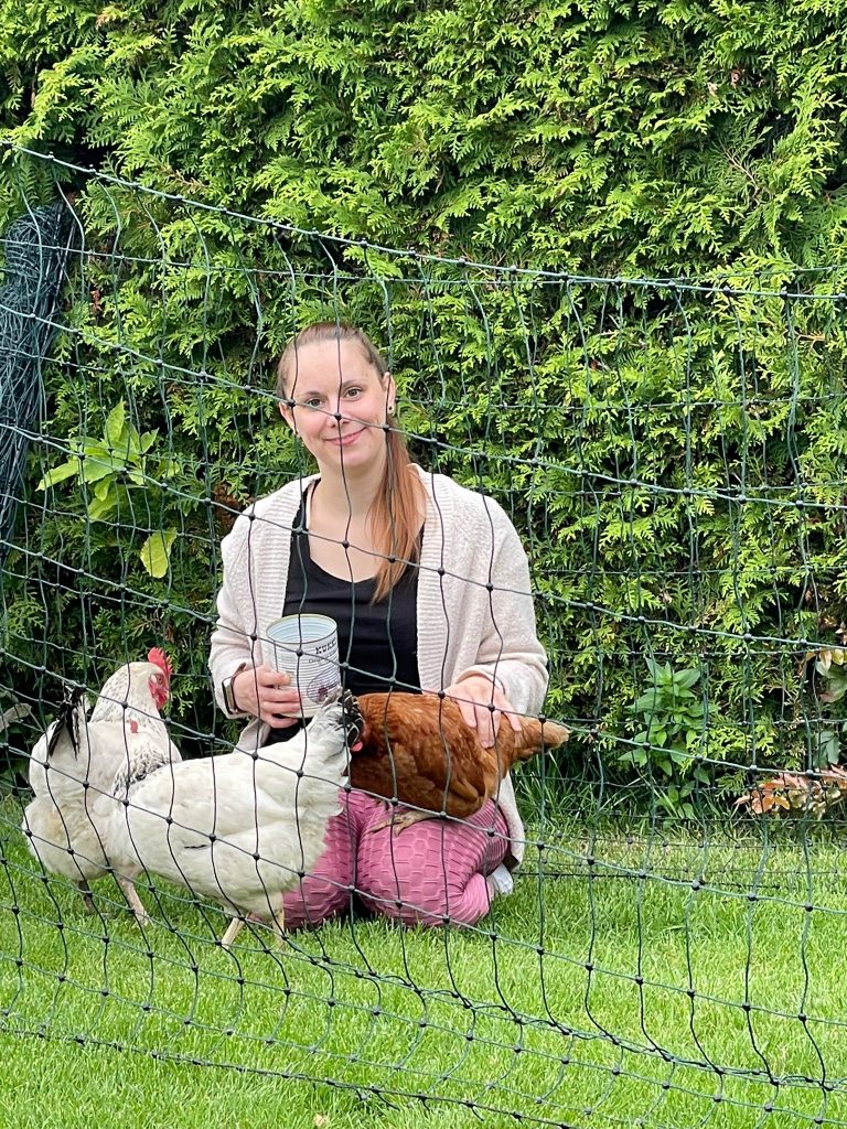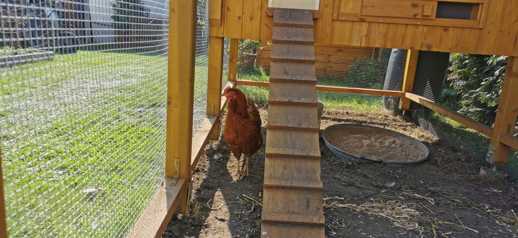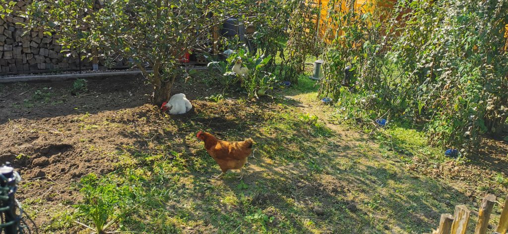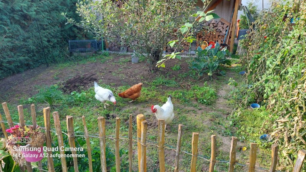 Wir haben den Hühnerstall heute frisch gekalkt, so mussten alle Hühner ins Freigehege. Da Magda immer noch brütet und sich den anderen gegenüber komisch verhält und dann von ihnen gehackt wird, haben wir sie getrennt. Liesbeth, Tilla und Trutchen sind heute auf die Beete gezogen.